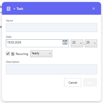 - Recurring tasks (Daily/Weekly/Monthly/Yearly)